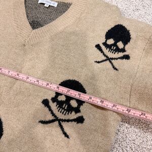 Miss Sparkling Skull & Crossbones V-Neck Sweater. Cozy, fuzzy tan/camel knit pullover featuring an all-over black skull and crossbones pattern. This relaxed-fit sweater is perfect for a Grunge, Goth, Punk, Rocker, or Y2K aesthetic. Great staple for fall/winter layering. Bought at a boutique store and never got the chance to wear it before I lost weight. It's so cute though and well made.