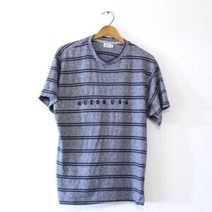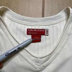 Authentic Guess Jeans short sleeve V-neck T-shirt in an off-white / cream color. Features detailed embroidered floral design at lower front and small embroidered graphic on upper back. Soft knit fabric with subtle vertical texture. Classic early-2000s Guess styling.