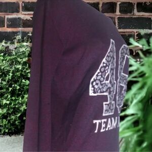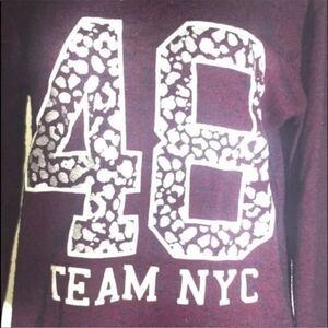 Sparkling Red Top ~ Sweater in a fine melange knit with a glittery, printed design and long sleeves. Slightly longer at back. I have a fabulous Y2K-inspired top from H&M that is perfect for adding some flair to your wardrobe. This dark red/maroon/burgundy burnout top is a true gem from the year 2015. It features a trendy leopard and cheetah animal print that says "Team NYC 48," making it a unique and stylish piece.