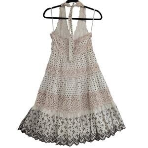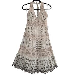 Y2K boho romance in this stunning BCBGMAXAZRIA halter midi dress. Featuring intricate embroidered eyelet lace, a flattering halter neckline with button closure, tiered panels, and a beautifully scalloped hem, this dress is a perfect blend of early 2000s nostalgia and modern quality. The soft ivory and beige palette, floral embroidery, and lined bodice highlight the great craftsmanship. Ideal for summer parties, festivals, or special occasions.