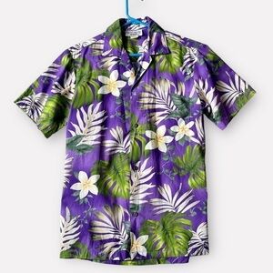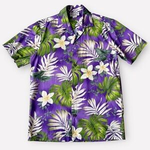 Y2K Hawaiian Print Button Front Shirt Floral Palm Print Purple Cotton Hawaii S