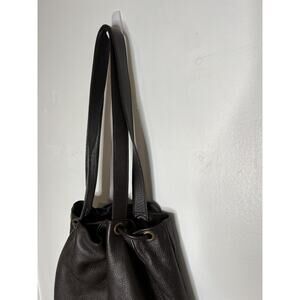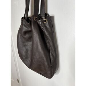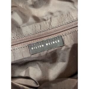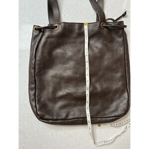 Add some vintage flair to your wardrobe with this stunning Y2K Hilton Weiner Leather Perforated Purse. This large shoulder bag is perfect for any occasion, whether it's a wedding, party, or business meeting. The bag features a drawstring closure and is made of high-quality brown leather with gold hardware accents.