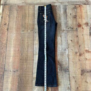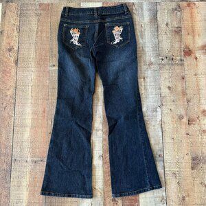 Y2K Hip Jeans USA denim boot cut with cowgirl boots and hat embroidered on the pocket, juniors size 5, are a unique and stylish throwback piece. Featuring a classic boot cut design and durable denim fabric, these jeans combine comfort with standout details. Perfect for adding a touch of vintage flair to your wardrobe!