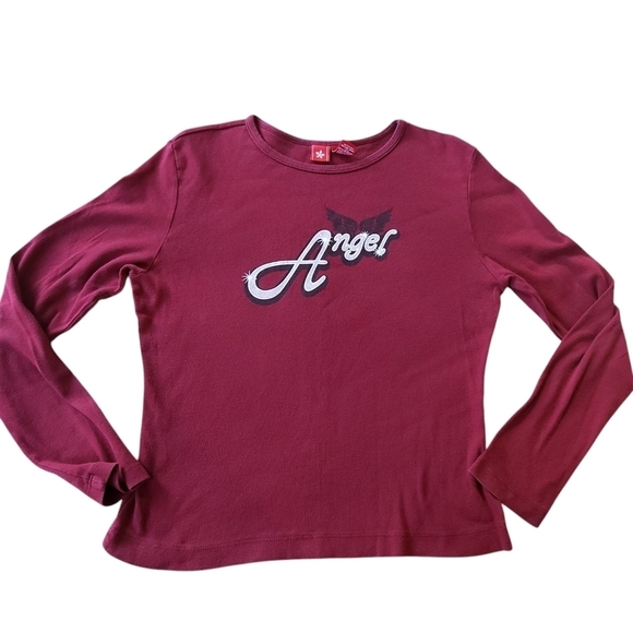 2000s Holiday Glitter Angel Ling Sleeve Top, Juniors sz XL. Maroon with silver glitter Angel spellout and black wings. Good used condition, don't see any holes or stains. Flat measurements approximately