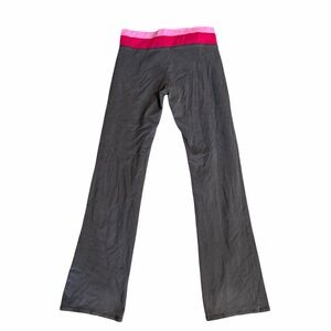 Grey flared yoga pants with pink waistband