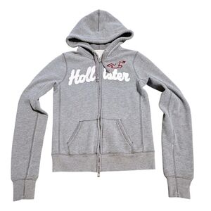 Throwback to the early 2000s with this iconic Hollister zip-up hoodie in a soft heather gray fleece. Features raised white chenille-style "Hollister" script across the chest with a red embroidered seagull logo. Cozy waffle-knit lined hood, kangaroo pockets, and a functional 2-way zipper make it a practical yet nostalgic Y2K staple.