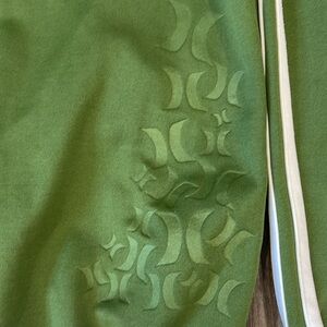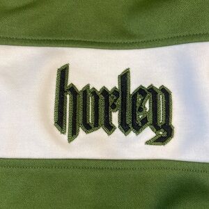 Y2K Hurley jacket in olive green with white stripes. Features a zip-up front monogram and back logo detail. Great condition small spot on back of right arm with slight discoloration as shown. Mens Large