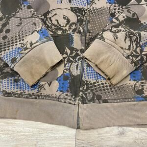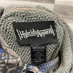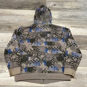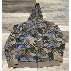 Y2K Hybrid Apparel Gray Blue Mens Medium Zip Up Skull Star AOP Hoodie Mallgoth cybergrunge skater streetwear. heavyweight, cotton polyester blend, Sherpa lined, ribbed cuffs and hem, full zip, drawstring, split kangaroo pockets, oversized baggy fit