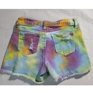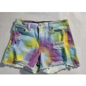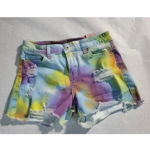 Keywords: tie dye shorts, denim shorts, distressed shorts, ripped shorts, frayed hem, colorful shorts, summer shorts, festival shorts, casual shorts, rainbow shorts, girls shorts, teen shorts, boho shorts, bohemian shorts