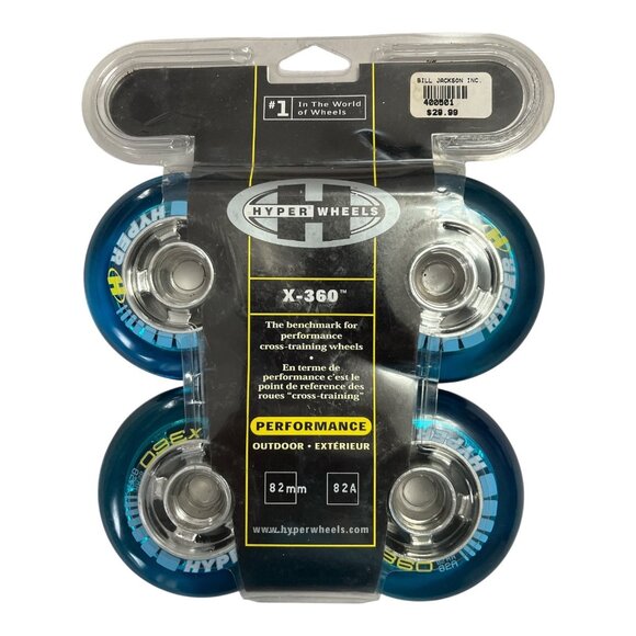 Vintage factory-sealed set of Hyper Wheels X-360 inline skate wheels. Designed for high-performance cross-training, these wheels combine durable urethane with an optimized 5-star race hub for excellent grip, control, and straight-line speed. A great collectible or upgrade for vintage skates.