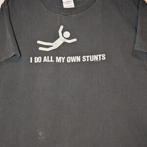 Description: Vintage Y2K I Do All My Own Stunts t shirt, front graphic only, black and whtie graphic, funny quote tee, guy falling design, comedy top, simple, stick figure, action, grunge, hardcore, skater, skateboarding