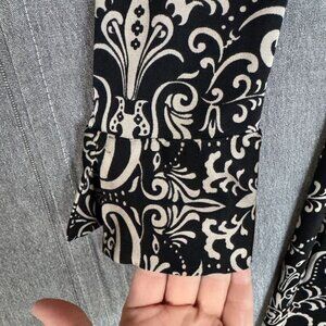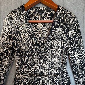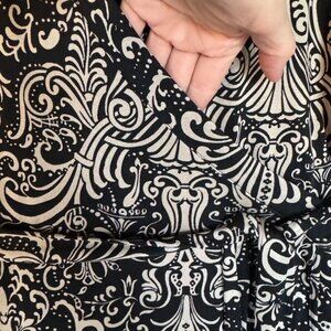 Y2K INC 100% Silk Black Tan Filigree Print Long Sleeve True Wrap Midi Dress