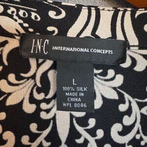 Y2K INC 100% Silk Black Tan Filigree Print Long Sleeve True Wrap Midi Dress Size Large