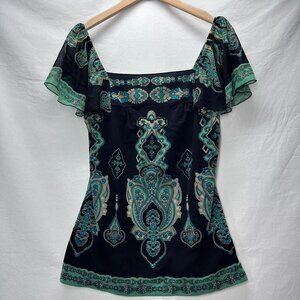 Y2K INC International Concept Boho Blouse Paisley Print Square Neck Flutter Sleeve Sheer Fabric Size Small
