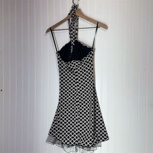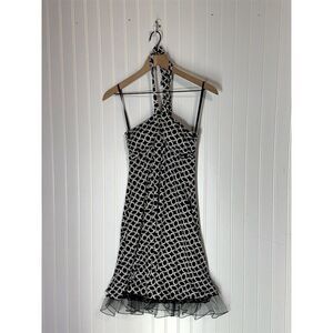 Y2K IZ Byer Halter Dress S Black White Circle Print Mesh Hem Made USA Cocktail