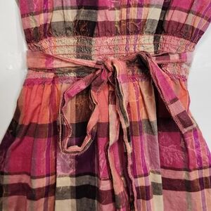 Y2K Inspired Mudd Girls Pink N' Orange Plaid Strappy Dress w/ Button-Up front N' Tie-Up Ruched Waist. Its tagged as a size 16 and its measurements are pit-to-pit 13.5" and length 32".
