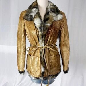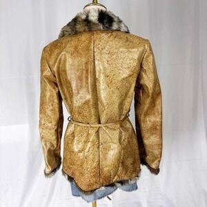 Y2K Italian leather jacket with faux fur collar and trim. Has a belt that ties at the waist. Has a boho / 70s retro look