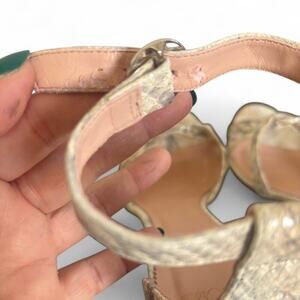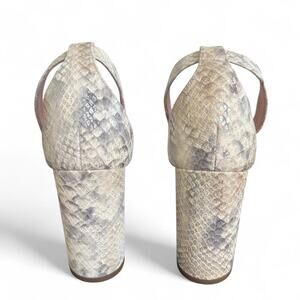 SO PRETTY BEAUTIFUL NEUTRAL LEATHER UPPER IN AN OFF WHITE/LIGHT GRAY/TAN SNAKE SKIN PRINT, ADJUSTABLE ANKLE STRAP, CUTE CLEAR FRONT EMBELLISHMENT. CHUNKY 3.5" HEEL.