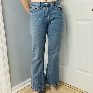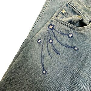 Style: Denim 100% cotton light blue flared bootcut jeans. Midrise. Embroidered cuffs and little shooting stars pattern. Casual, Y2K, vintage, western, and Softgirl styles. Daisy Jones energy