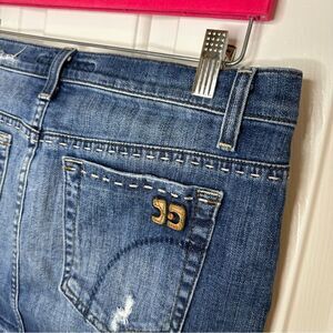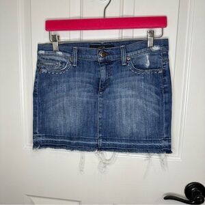 Y2K Joe’s Jeans Distressed Raw Hem Leather Logo Denim Mini Skirt Waist 27 2000s