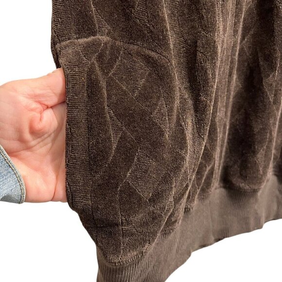 This brown short-sleeved fair isle embossed velour hoodie is crafted from a soft and luxurious velour fabric in a rich shade of brown. Velour is a plush knit fabric that resembles velvet but has more stretch and durability, making it comfortable to wear.