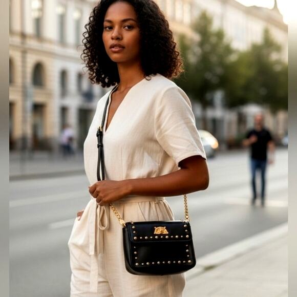 Y2K Juicy Couture Crossbody Shoulder Bag Black Leather Gold Studs Chain Rare VNT