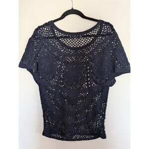 Juicy Couture Women's Size Large Y2K Short Sleeve Pullover Crochet / Open Knit / Net Top / Swim Cover Up Dark Blue Beachy Resort Iconic Retro