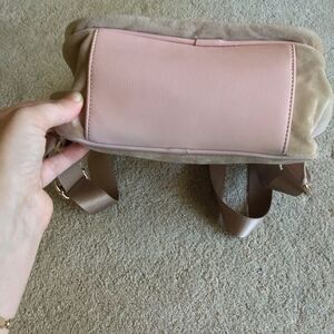 Elegant Juicy Couture backpack with heart charm. Beige body with pink accents. Ideal for daily style.