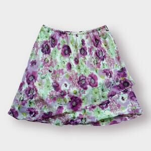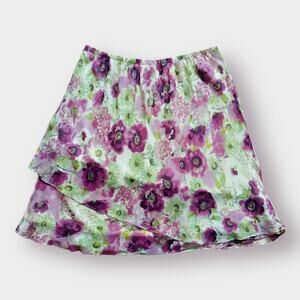 Knee length skirt with asymmetrical layered hem. Elastic waist. Built in slip layer.