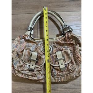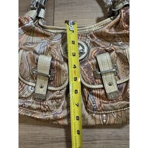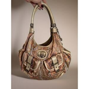 Add some Y2K flair to your wardrobe with this gorgeous Kathy Van Zeeland satchel purse. This bag features a unique muted paisley fabric in shades of beige, orange, blue, and white, paired with pebbled faux leather trim. The front displays Kathy’s signature crown emblem in silver-tone hardware, along with a matching heart charm keychain for extra detail.