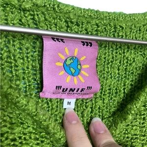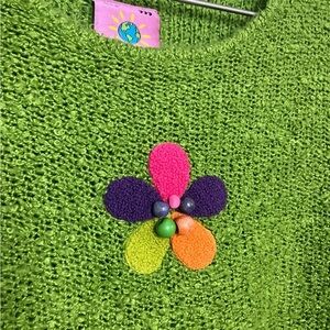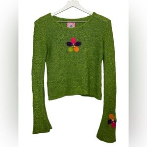 UNIF “Somer” Sweater Y2K 2000s Retro Knubby Knit Cropped Length Sweater Indie Artsy Floral Beaded Bell Sleeves in Lime Green, size medium.
