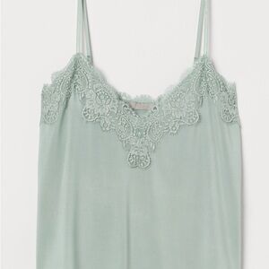 This elegant satin top features a delicate lace trim, perfect for adding a touch of sophistication to any outfit. The soft green hue is both refreshing and versatile, making it a must-have for your wardrobe.