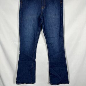 These are a fabulous pair of classic mid-rise "Sofia Boot" jeans from Lucky Brand, perfectly tapping into the current Y2K trend. They feature a flattering, comfortable bootcut silhouette and are constructed from a dark wash denim, making them versatile for dressing up or down. The blend of 99% Cotton and 1% Spandex offers a comfortable, structured fit with a slight stretch, perfect for everyday wear. The size tag indicates 12/31 Long, suggesting a long inseam for a great fit. These are a timeless staple piece for any wardrobe.
