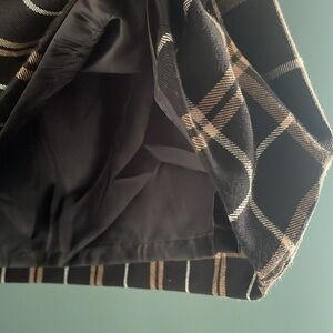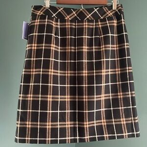 New with tags , step into true Y2K style with this classic Laura Scott plaid skirt. Preppy esthetics Featuring a tan and ivory check pattern on a black base, this A-line skirt has a timeless preppy-academia feel. The bias-cut waistband and tailored fit give it a polished look, while the mid-thigh/above-knee length makes it easy to style with boots, tights, or a cozy sweater.