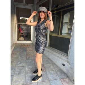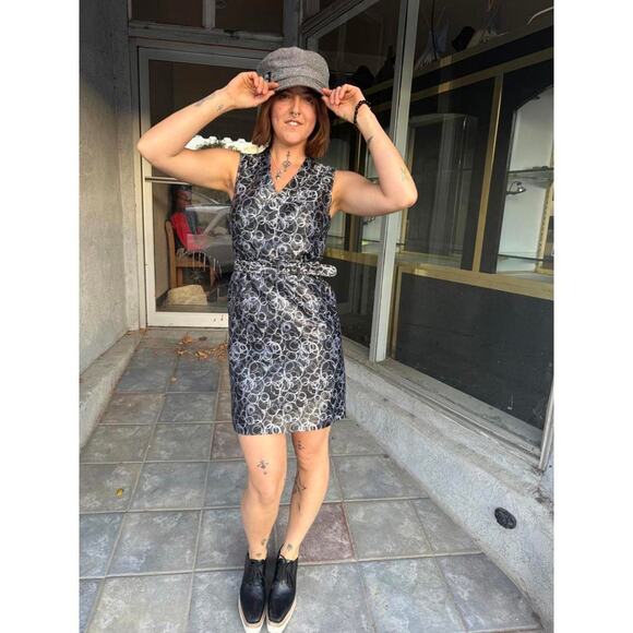 Chic Lavender Label Vera Wang sleeveless metallic wrap dress featuring a striking silver and charcoal swirl print with a self-tie waist and clean tailored silhouette. Fully lined for a smooth, structured fit — a perfect balance of timeless elegance and modern edge. From Vera Wang’s early 2000s Lavender Label collection (circa 2005–2010).