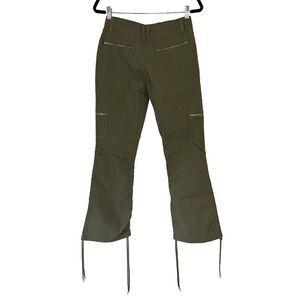 Turn back time with these early 2000s Y2K cargo pants from Lazer Jeans. Made from a lightweight cotton-spandex blend with subtle stretch, these pants feature a dark olive green ripstop grid fabric, silver zippered cargo and hip pockets, and adjustable drawstring hems for a customizable fit. Mid-rise with a slightly flared leg, these pants nail that classic utilitarian streetwear vibe.