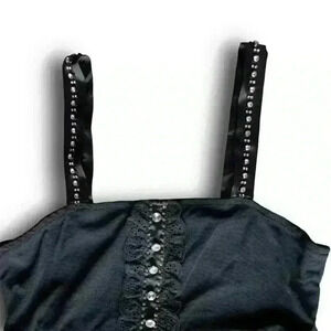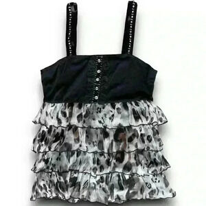 The most gorgeous and unique ultra hard to find 2000s babydoll japenese street style sleeveless, cheetah leopard print ruffled tier blouse. Black silk bust & straps beaded with rhinestone bling accents, frilly lace detailing in size large. Excellent pre owned condition.