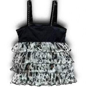 100% nylon, 100% silk Vintage Y2K Leopard Print Ruffle Tier Black Silk Beaded Babydoll Top Sleeveless Rhinestone Frilly Lace Fairy Blouse