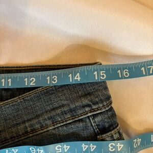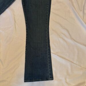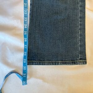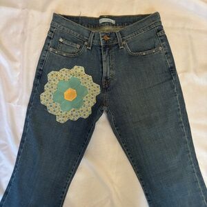 These Levi's 515 Boot Cut Size 8 SHORT with owner addition of blue, yellow and white patchwork flower on right leg is in good pre-owned condition. There are some distressed areas that seem to be part of the look of these jeans. No rips or stains. 7/2008 manufacture date.