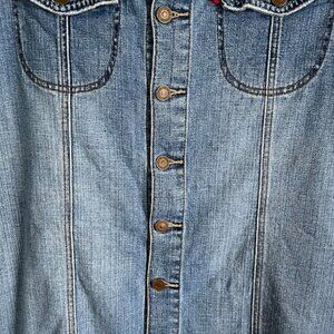 Super trendy skirt in stretch denim; functional buttons all down the front and it has pockets! I'm sad to let it go, I'm a 14/16 (closer to 14) and it is way too big on me. It definitely would fit a true 16!