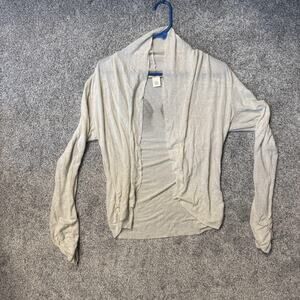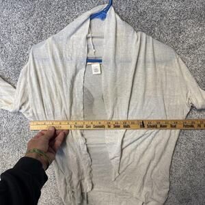 Design features: Lightweight draped open front; long sleeves with ruched cuffs; angel wings graphic on back