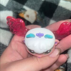 Adorable toy figure with pink body and white hair. Features vibrant red wings and green eyes.