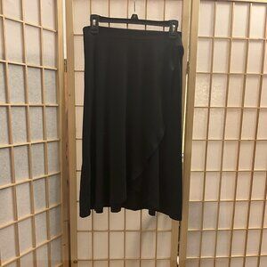 Cute and easy little skirt that will go with everything in your closet! Living Doll black faux wrap, tie waist skirt, size junior's medium. It has an elastic waistband that is gathered in the back and flat in the front. The front has a ruffled layer that wraps over and ties at the waist for a cute wrap look (without the worry that it will come untied and your skirt will fall off!). Excellent condition. Knee length, unlined; the fabric is not sheer. Fabric: 96% rayon, 4% spandex (care: machine wash cold, tumble dry low, cool iron if needed).