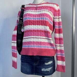 Y2k Liz Claiborne Striped Sweater Pink White Cable Knit Preppy