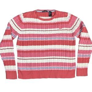 Late 90s/ Y2K Liz Claiborne Stripped Cable Knit Sweater, Pink, Blue, White Tones Preppy, 100% Cotton, Size Large, Good Condition