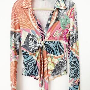 Orange, pink and blue, y2k 2000s floral abstract long sleeve blouse with a v-neck plunge neckline, and collar. So cute for the fall paired with a black mini skirt and knee high boots.