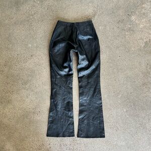 Elements by Vakko low rise leather bootcut flares featuring ultra low rise waistline, front center zip, perfect fitted silhouette and flared hemline. Excellent condition. Marked size 2. Please refer to measurements listed below to ensure fit.