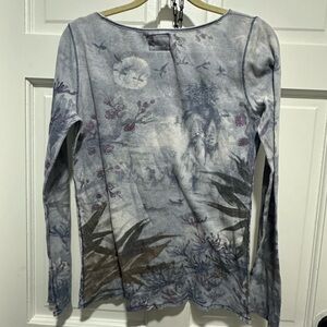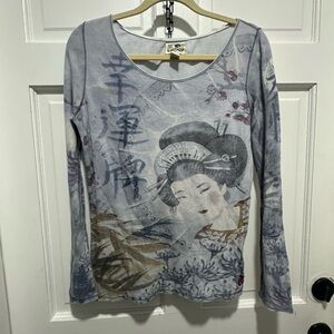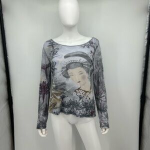 Y2K Lucky Brand Tattoo Print Long Sleeve Top Geisha Print Boho Grunge Size L