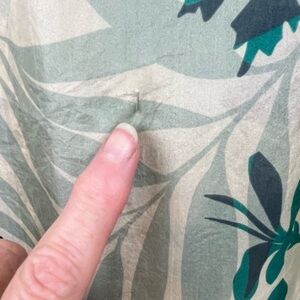 The size and material tag are missing, please look at pictures to find measurements to ensure fit. I think it would be a small. I think the material is either silk or silk blend by feel, but cannot be sure. There is a small rip on the back of dress please see pointing photo for details.