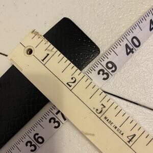 This Y2K Michael Kors belt features a sleek black design with a synthetic crocodile textured material, accented with the signature MK logo buckle. The medium width belt is designed for a waist size of 36-37 inches, making it a perfect accessory for fashion-forward women. The silver hardware and logo accents add a touch of luxury to this stylish fashion belt by Michael Kors.